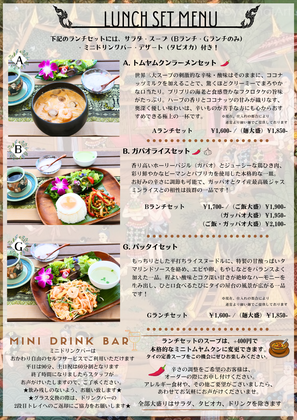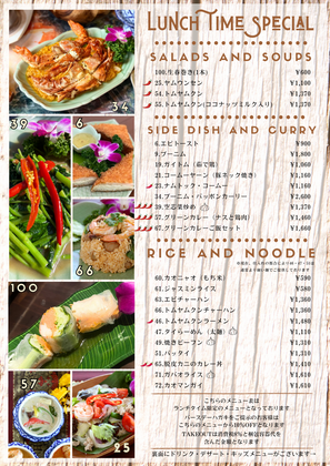 1 とり皮の唐揚げ 2 なんこつの唐揚げ 4 タイ風なんこつの唐揚げ 6 エビトースト 7 タイ風さつま揚げ🌶 8 エビのすり身揚げ 9 プーニム 10 生春巻き 11 ヤムサーモン 12 ネーン🌶 13 サイウア🌶🌶 14 カイチャオ 15 紋甲イカ焼き 16 クンパオ (エビの姿焼き) 17 ポテト饅頭 18 手羽先焼き 19 蒸し鶏 20 ガイヤーン 21 コームーヤーン 22 ラープムー🌶 23 ナムトックコームー🌶 24 ソムタム🌶 25 ヤムウンセン🌶 27 ヤムムームー🌶 28 ヤムカイダーオ🌶 30 ロムの花サラダ 31 ピータンのサラダ🌶 33 ムール貝のハーブ蒸し🌶 34 脱皮カニのカレー炒め 35 エビのカレー炒め 37 ティラピアの姿揚げ🌶🧄 38 雷魚の姿揚げ🌶 39 空芯菜炒め🌶🌶🌶🧄 40 ナスと豚肉のバジル炒め🧄 41 ひき肉とバジル炒め🌶🌶🧄 挽肉は『鶏、豚、牛』からお選びください。 42 ガイパッキン 43 クンオブウンセン 44 パップンセン🧄 45 あんかけ豆腐 46 トムヤムクンラーメン🌶 47 タイラーメン(太麺)🧄 48 タイラーメン(細麺)🧄 49 焼きビーフン🧄 50 焼きビーフン(太麺)🧄 51 パッタイ 52 汁なしラーメン🧄 53 あんかけそば 54 トムヤムクン🌶 55 トムヤムクン🌶ココナッツミルク入り 56 豆腐スープ 57 グリーンカレー🌶🌶🌶 58 パネーンカレー🌶🌶 59 マッサマンカレー🌶 60 もち米 61 ジャスミンライス 62 そうめん 63 エビチャーハン 64 パイナップルチャーハン 65 脱皮カニのカレー丼 66 トムヤムクンチャーハン 67 グリーンカレーセット🌶🌶🌶 68 パネーンカレーセット🌶🌶 69 マッサマンカレーセット🌶 70 空芯菜炒めとご飯🌶🌶🧄 71 ガパオライス🌶🌶🧄(鶏・豚・牛) 挽肉は『鶏、豚、牛』からお選びください。 72 カオマンガイ | 660円(税込) 660円(税込) 690円(税込) 780円(税込) 920円(税込) 980円(税込) 1,480円(税込) 1,260円(税込) 970円(税込) 950円(税込) 950円(税込) 790円(税込) 890円(税込) 1,080円(税込) 770円(税込) 840円(税込) 940円(税込) 1,030円(税込) 1,030円(税込) 1,030円(税込) 1,030円(税込) 1,080円(税込) 970円(税込) 950円(税込) 930円(税込) 880円(税込) 930円(税込) 1,360円(税込) 2,260円(税込) 1,450円(税込) 1,830円(税込) 2,260円(税込) 1,240円(税込) 990円(税込) 1,010円(税込) 1,110円(税込) 1,320円(税込) 1,200円(税込) 940円(税込) 1,345円(税込) 990円(税込) 990円(税込) 1,180円(税込) 1,180円(税込) 1,180円(税込) 990円(税込) 1,180円(税込) 1,240円(税込) 1,240円(税込) 770円(税込) 1,330円(税込) 1,330円(税込) 1,330円(税込) 470円(税込) 460円(税込) 460円(税込) 1,230円(税込) 1,360円(税込) 1,280円(税込) 1,230円(税込) 1,520円(税込) 1,520円(税込) 1,520円(税込) 1,470円(税込) 1,470円(税込) 1,470円(税込) | |